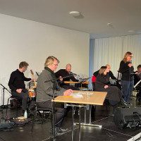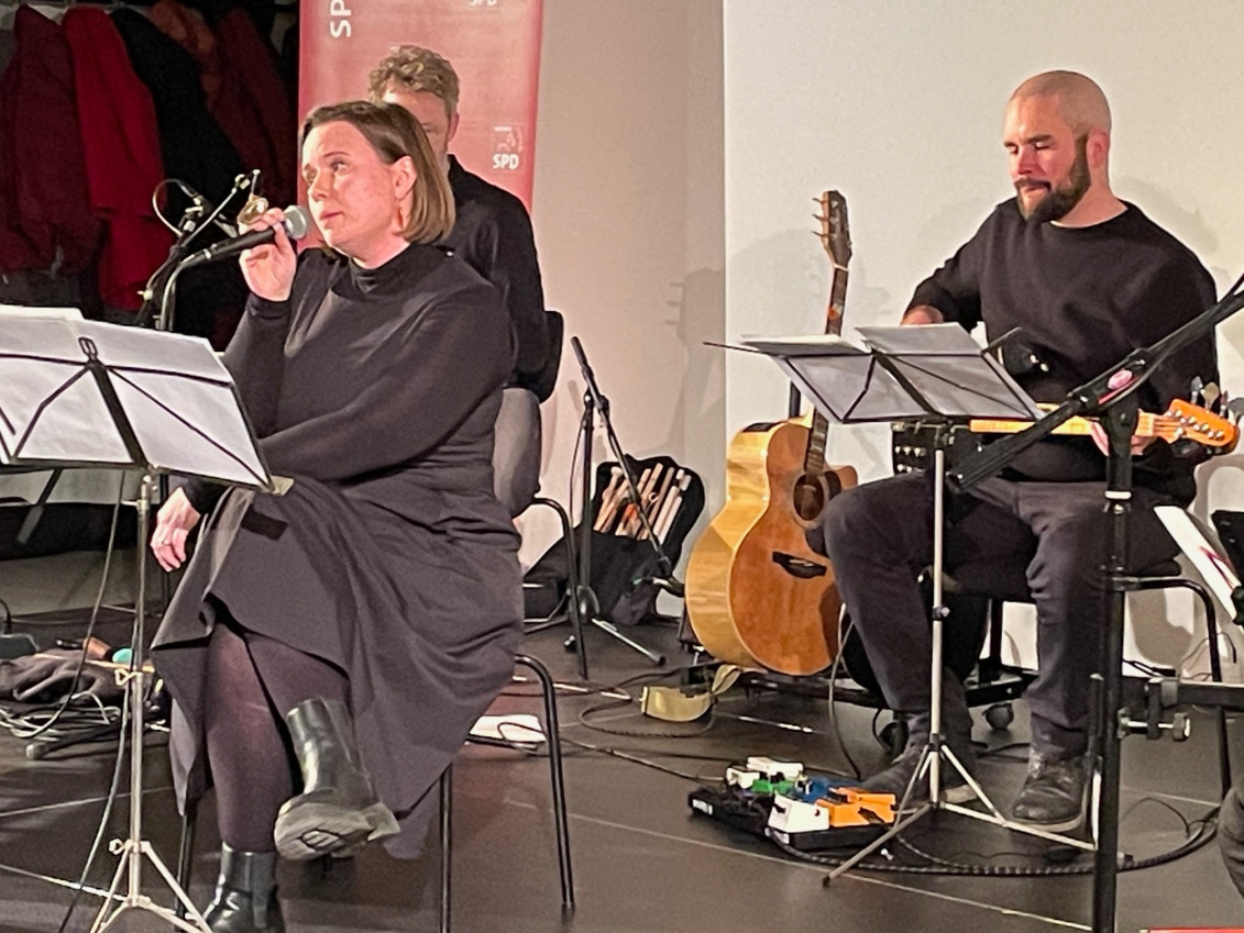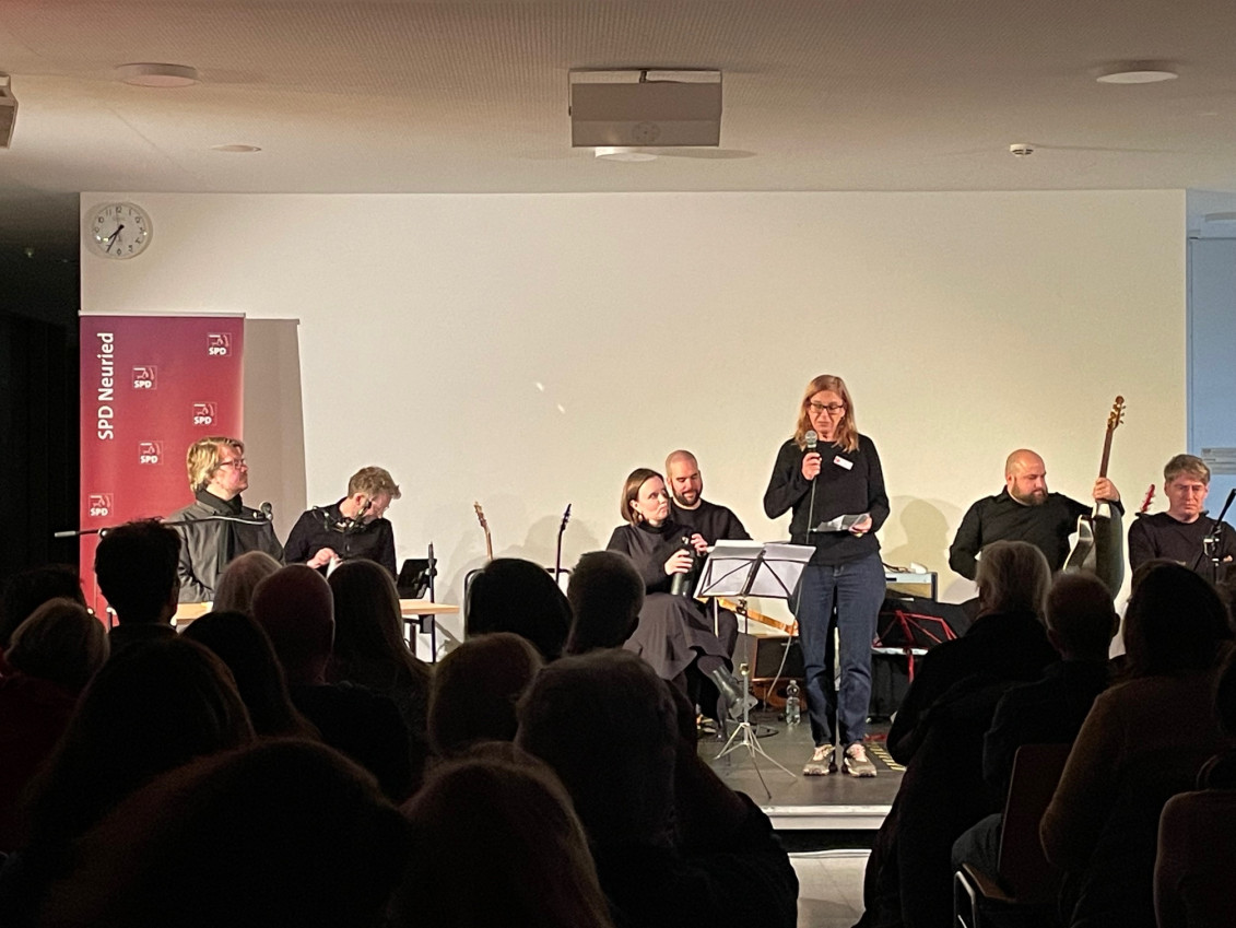 Das Sendlinger Revolutionsensemble gastierte zum dritten Mal auf Einladung der SPD Neuried in der Aula der Grundschule. Ortsvereinsvorsitzende Mechthild von der Mülbe sagte bei der Begrüßung: "Wir freuen uns nicht nur auf ein Wiedersehen mit dem Ensemble, sondern auch auf eine Premiere: Das neue Programm "Leben unter Vorbehalt - Ein Rückzug ins Exil" wird heute zum ersten Mal präsentiert."